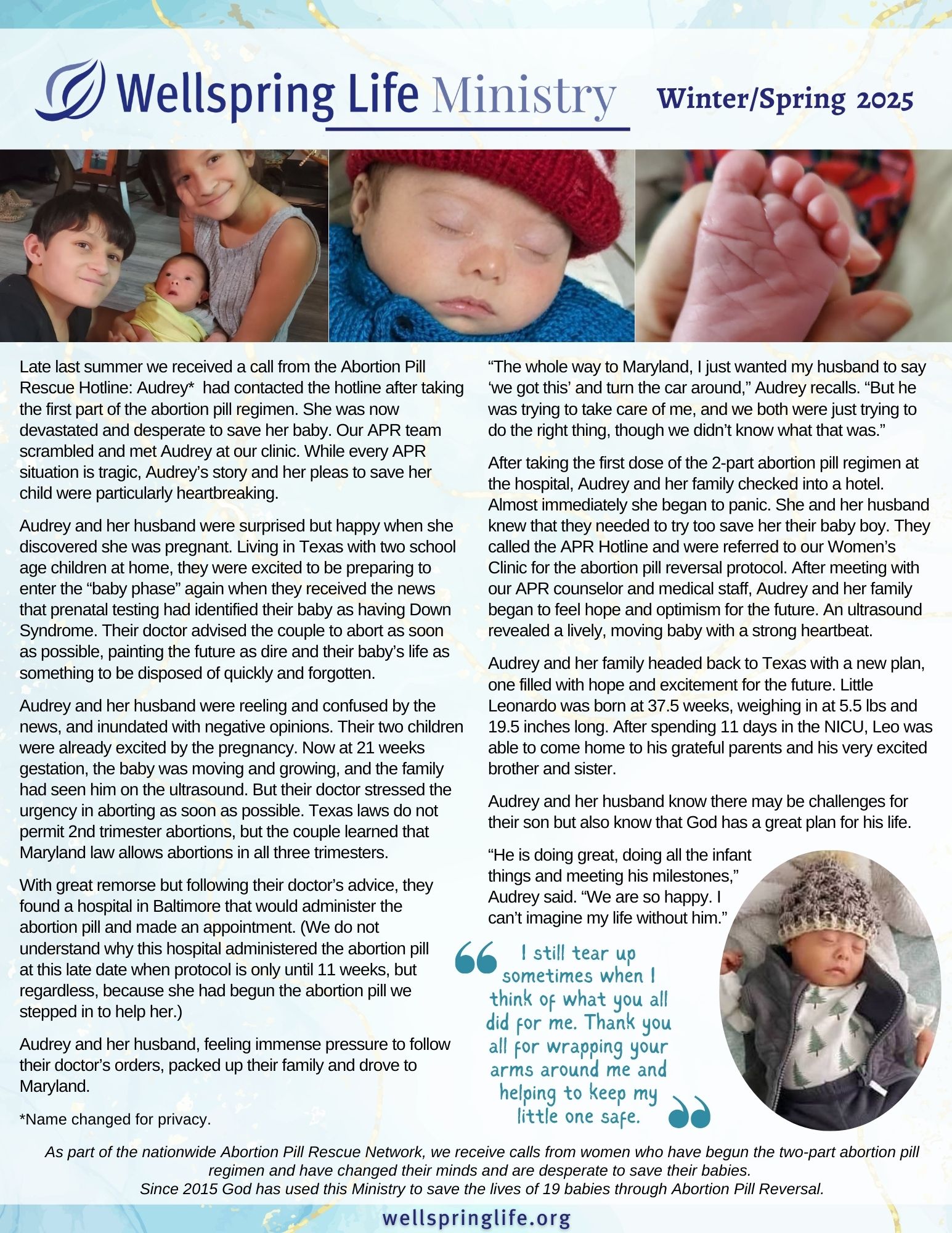 We are blessed to share this story of our client Audrey and her family, whose lives were changed by a prenatal DS diagnosis. Despite intense pressure by medical professionals to abort, little Leo’s life was saved. Follow this link to our recent newsletter to read Audrey’s story: https://wellspringlife.org/…/Winter-2025-newsletter